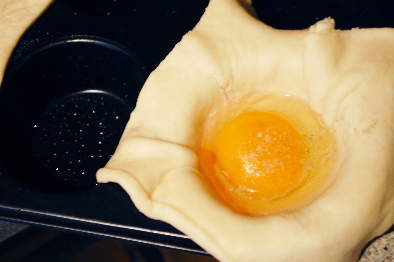 Nun schlagt ihr ein Ei auf, gebt etwas Eiweiß ab und füllt das restliche Eigelb und Eiweiß in euer Teigbett. Das Ganze könnt ihr nun nach Belieben würzen mit Pfeffer und Salz.