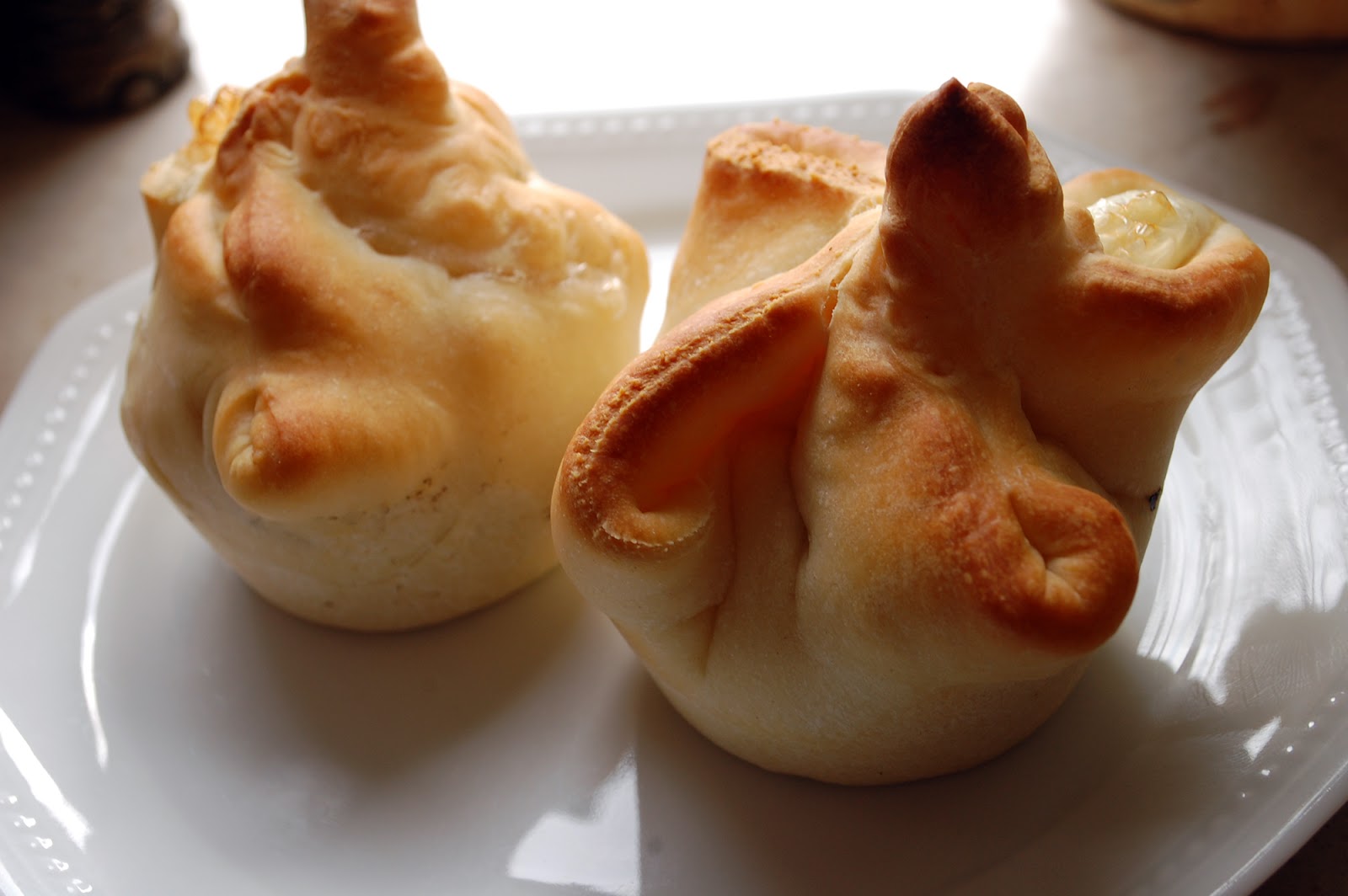 Im Anschluß werden die Teigecken oben etwas ‚verknotet‘ oder so gerollt, wie ich es getan habe.
